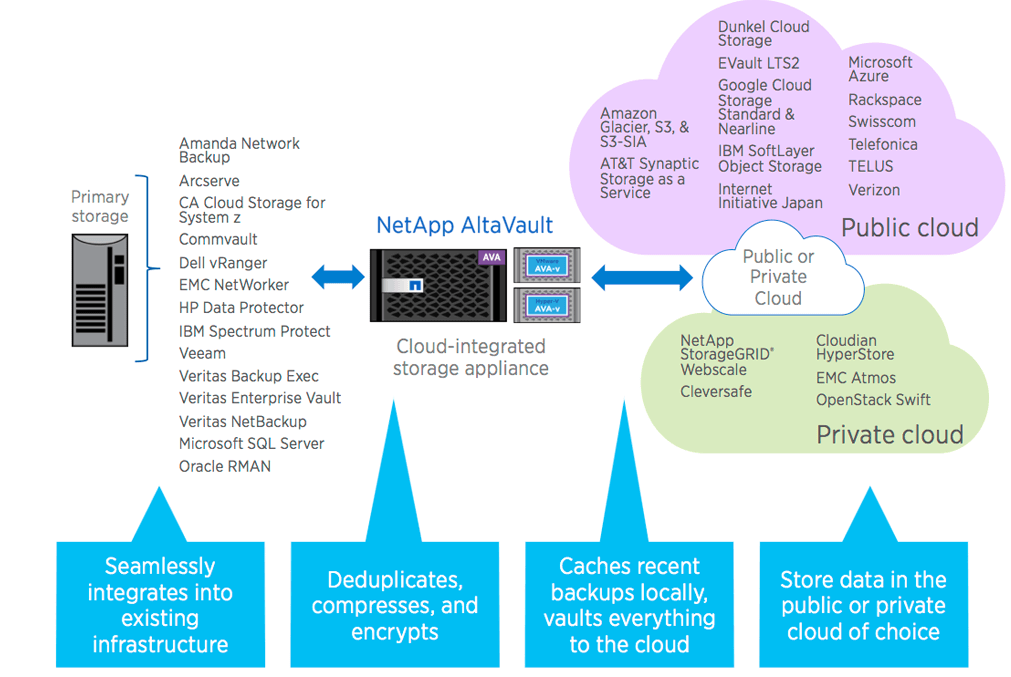 Step up NetApp AltaVault. AltaVault is a cloud integrated backup appliance, presenting itself to your existing backup solution (so not necessarily any need to change that) as a backup target, while at the other end of the appliance – it talks to an object store, be that yours, or more likely a cloud based service (such as Azure, Amazon, Softlayer etc..) the AltaVault appliance then works as a gateway between your on-premises solution and your business appropriate object store, deduplicating, compressing and encrypting data before sending it off to your storage repository, for performance it also caches a large segment of that data for local recovery of the most recent data sets, as well as of course optimising the performance as the backup/archive job is written to it.