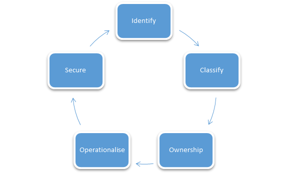 The graphic highlights the continual cycle of data protection which starts with identifying what data we have through to classifying it and ensuring its security. The important part of this, is that it is a cycle, not a one-off activity and therefore requires consistent monitoring and review.