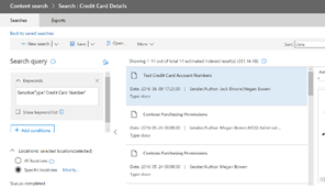 We start by defining our query, in the graphic you can see we have created a query to look for credit card numbers across our SharePoint sites, once the query is triggered, we can preview as well as export the results for further analysis. This allows us to quickly identify any sensitive data we have so we can start to define appropriate policies to maintain the security of this information.