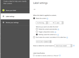Now we have identified this data it’s important that we classify it and employ rules to ensure its security and appropriate use. 365 uses labels to define and apply these rules via two distinct label types, security and retention, which allow us to protect data from accidental (or malicious) misuse and ensure we keep it for the appropriate amount of time and are defined as follows;